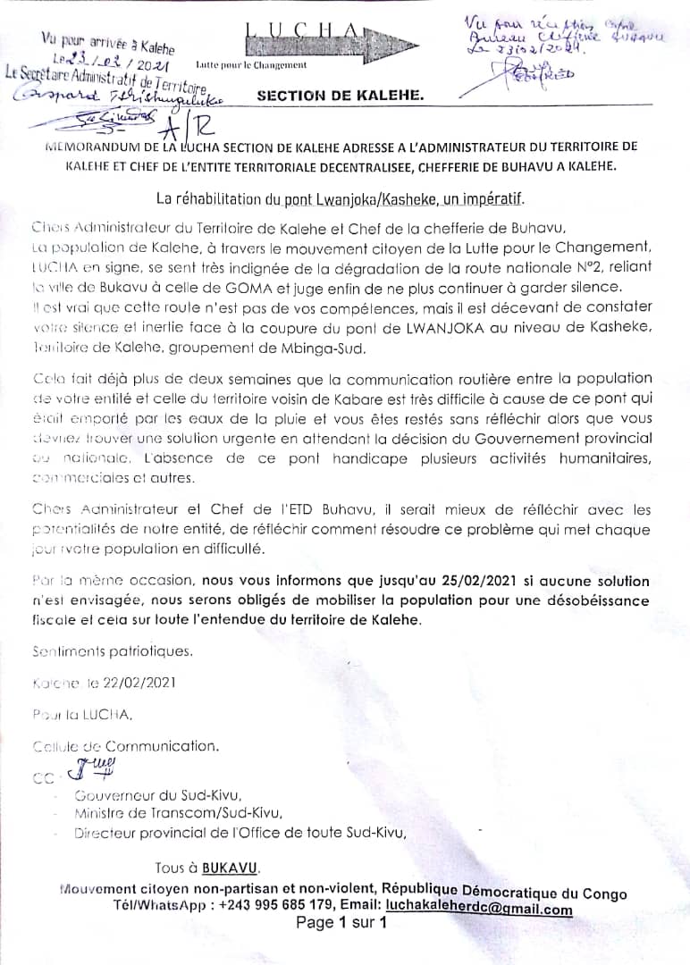 Dans un mémorandum adressé au chef du territoire de Kalehe dans cette entité décentralisée du Buhavu, la Lucha réclame la réhabilitation immédiate du pont Lwanjoka/Kasheke se trouvant dans le groupement Mbinga-Sud.