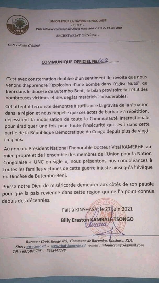 Le parti politique Union pour la Nation Congolaise, UNC,parti cher à Vital Kamerhe, compatit avec les victimes de l’explosion d’une bombe dans l’Eglise Butsili dans le diocèse de Beni-Butembo dans la province du Nord Kivu.