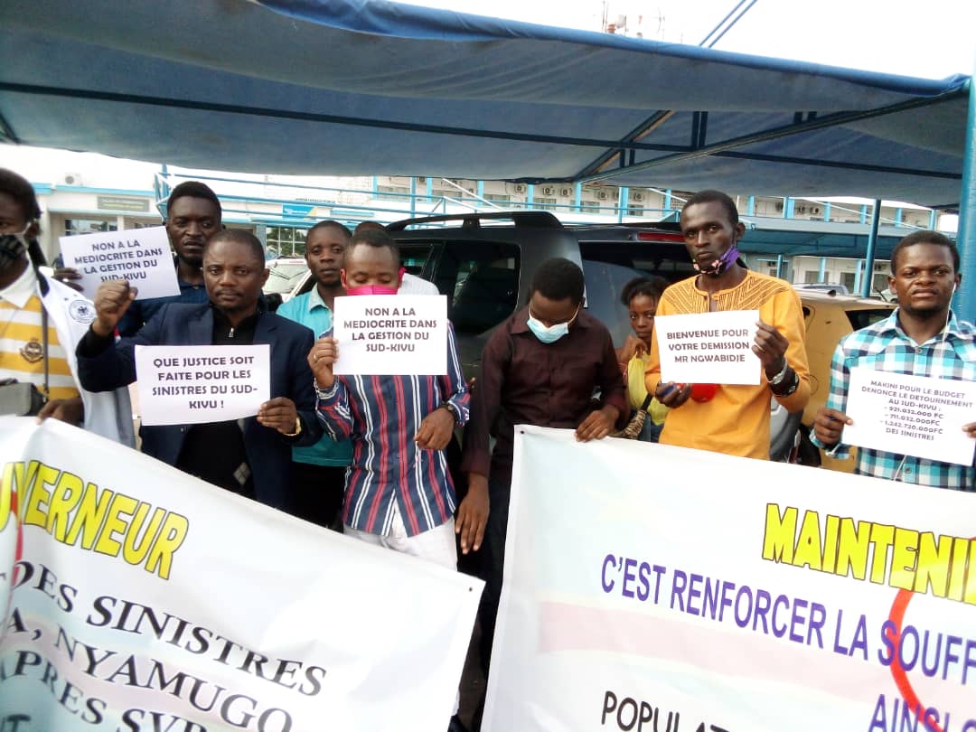 « Non à la médiocrité dans la gestion du Sud-Kivu. Que justice soit faite pour les sinistrés du Sud-Kivu. Bienvenu pour votre démission Mr Ngwabidge. Mégestion, détournement et incompétence, Theo Ngwabidje dégage ».
